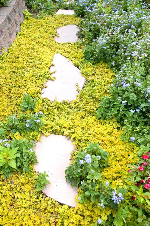 We just can’t get enough Golden Creeping Jenny in our gardens! Though it’s a super-fast grower that quickly fills a space, its soft vines make Creeping Jenny very easy to manage and keep in bounds. The bright golden yellow foliage is a wonderful contrast to other plants in the garden or in pots. Looks especially nice around plants with red, burgundy, purple or dark green foliage. In cooler climates the foliage turns orange during winter. Though it doesn’t look like it would be cold hardy, Creeping Jenny can handle temperatures down to 30 degrees below zero Fahrenheit!