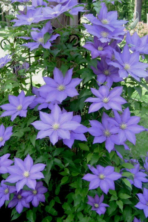 One of the most stunning Clematis in our gardens, and winner of the prestigious Award of Garden Merit by the Royal Horticultural Society, ‘H. F. Young’ will not go unnoticed with it’s abundant display of enormous, dinner plate sized star-shaped flowers up to 9 inches across in shades of light to lavender blue with an alabaster to sifter blue midrib on each petal. The overlapping petals surround prominent creamy white and yellow anthers. Absolutely breathtaking in bloom. The first bloom cycle occurs in late spring to early summer and is followed by a second show of flowers in late summer to early fall. At 8 to 10 feet tall, H. F Young is ideal for growing on arches, fences, rails, trellises, obelisks and posts.