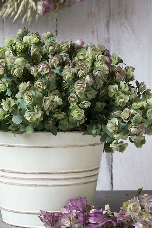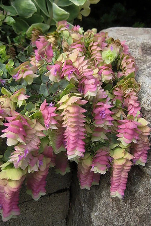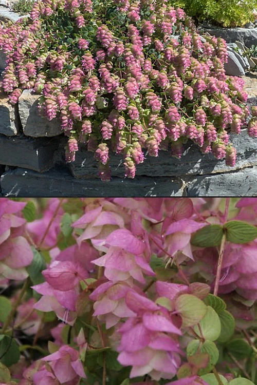 Kent Beauty is an ornamental Oregano that certainly lives up to its name. Although the foliage is aromatic, it is not of the quality expected for culinary purposes and is usually not used in cooking. What it lacks in flavor, it entirely makes up for in beauty. Everything about this plant is difficult to describe. It is a spreading perennial plant to maybe 12 inches tall and 18 inches wide with wiry stems clothed in silvery blue-green, eucalyptus-like leaves. In early to midsummer, chains of delightful mauve-pink bloom-like bracts similar in appearance to hops form at the tips of every stem on the plant. The flowers can be cut and hung to dry for use in crafts. It can be grown as a groundcover or low border in garden beds, or used as a spiller over walls and the edge of containers. The secret to the best success with it is well-drained soil that never stays constantly soggy, and six or more hours of sunlight daily. Kent Beauty is one of those plants you’ll always look forward to its bloom from midsummer well into fall, and is a captivating plant that is sure to be a conversation piece.