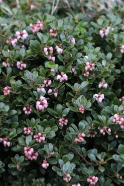 A very attractive and cold-hardy North American native evergreen shrub, Arctostaphylos uva-ursi ‘Massachusetts,’ commonly known as Bearberry, is a prostrate form of the species that only reaches a foot tall, spreading 5 to 6 feet wide. It features lustrous dark green evergreen leaves that are smaller than those of the species, providing a unique and attractive texture in the landscape. In mid to late spring, it produces abundant clusters of soft pink-to-white bell-shaped flowers, followed by ornamental red berries displayed in fall and persisting into winter. The hummingbirds, butterflies, and beneficial pollinators will appreciate the flowers, and the berries are enjoyed by birds. The foliage turns from green to red or reddish-purple in fall, persisting through winter and turning back to green in spring. Very easy to grow and resistant to drought and disease, Massachusetts Bearberry is a nice accent in smaller garden spaces and rock gardens, or grouped or as a border where space allows in landscape borders. It is excellent for underplanting small trees. You might also be happy to know deer aren’t interested.