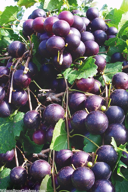 A more recent patented release by the UGA College of Agricultural and Environmental Sciences, the ‘Paulk’ Muscadine offers reliable and higher yields of bigger fruit for both home gardeners and growers. It is self-fertile, meaning that it doesn’t require a pollinator plant to produce fruit. In the past, only female muscadine cultivars could produce large fruit, and they needed the help of a pollinator plant to do so. Extemely productive, the vigorous vines produce abundant, very large deep purple fruits that ripen mid season and weigh in at an average 15 grams! The fruits have excellent flavor and a dry stem scar so are very easy to pick without damaging them. An exceptionally reliable and easy to grow Muscadine that will please with a bounty of deliciously sweet grapes. Hardy in USDA Zones 7-10b.
