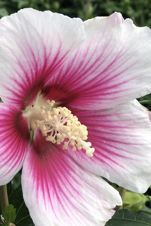 Hailing from Minier Nurseries in France, the ‘Pink Ink’ Rose of Sharon was appropriately selected and named for the large size and incredible and unusual coloration of its flowers. Each pure white, tropical hibiscus-like bloom is tie-dye style painted with red, dark pink and purple at the center that streaks to the outside petal edges for the look of a tropical hibiscus, but on a cold hardy rose of sharon! Hardy to as far north as Zone 5a and heat hardy to 9b, Pink Ink is a showstopper that the hummingbirds will thank you for planting!