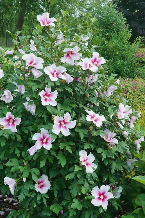 Growing 6 to 8 feet tall and 4 to 5 feet wide, the Pink Ink Rose of Sharon is ideal for use as a specimen or in groupings in sunny landscape and flowering shrub borders and home foundation plantings. As this Rose of Sharon grows taller, lower branches can be removed to form a small tree that serves well as a highly attractive and colorful focal point specimen tree. A fine addition to hummingbird gardens, cottage gardens and white theme gardens.
