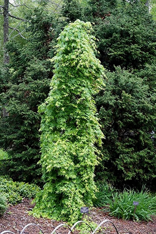 Recognized by professionals as one of the most beautiful and durable weeping lace-leaf Japanese Maples in existence. Ryusen is a rare masterpiece that doesn’t just weep, its branches cascade dramatically downwards like a waterfall! The branches of this selection are more like vines than branches, which means you can train them to cascade over walls or even to climb up and over an arch. Those of you in the hot South will be happy to know Ryusen stands up to both full sun and the heat. Spring and summer foliage is a vibrant green turning to shades of burgundy in fall and finally to vibrant shades of red, orange and gold.