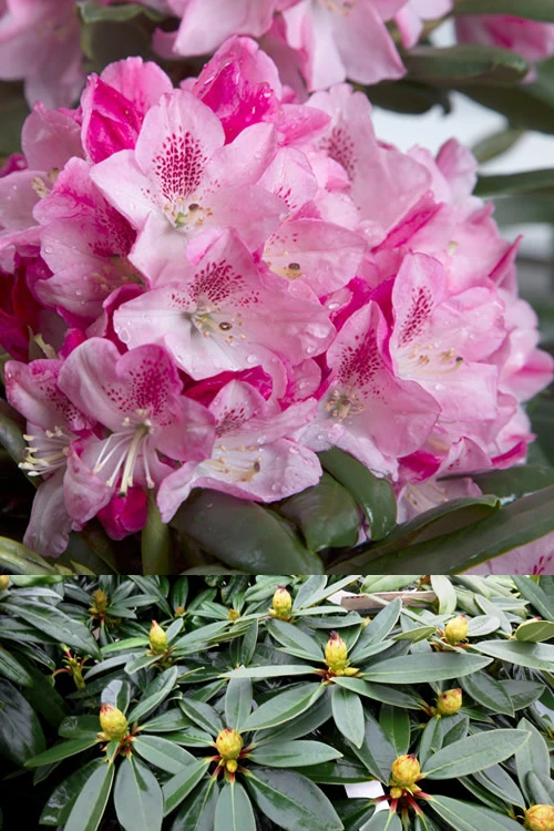 Southgate Splendor Rhododendron produces abundant clusters of large and ruffled gorgeous multi-colored white, light pink, and dark fuchsia-pink flowers with a splash of deep red spots that appear in spring atop mounds of lustrous, evergreen, dark green foliage.